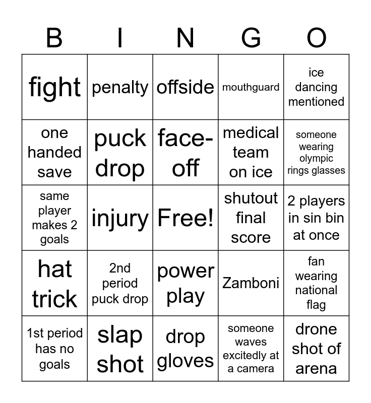 This bingo card has a free space and 32 words: someone waves excitedly at a camera, announcer mangles Italian, injury, “Heated Rivalry” mention, hat trick, puck drop, ice dancing mentioned, fan wearing national flag, penalty, ref reviews play, face-off, offside, goalie makes 8+ saves, goalie makes 15+ saves, shutout final score, overtime, 1st period has no goals, same player makes 2 goals, power play, 2nd period puck drop, Zamboni, person drinking beer in stands, 2 players in sin bin at once, slap shot, drone shot of arena, mouthguard, medical team on ice, one handed save, fight, drop gloves, drop stick and someone wearing olympic rings glasses.