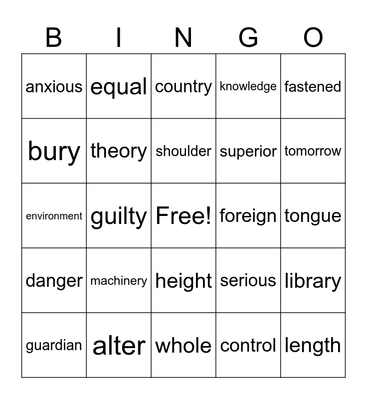 This bingo card has a free space and 24 words: machinery, alter, shoulder, guardian, fastened, anxious, bury, equal, foreign, height, superior, environment, serious, library, theory, control, tongue, country, tomorrow, guilty, length, danger, knowledge and whole.