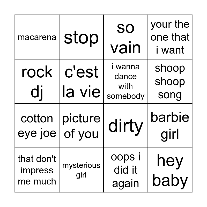 This bingo card has 53 words: man, i feel like a woman, that don't impress me much, no scrubs, girls just wanna have fun, its raining men, wannabe, stop, reach, c'est la vie, hold on, i wanna dance with somebody, i think we're alone now, heaven is a place on earth, dancing queen, mama mia, proud mary, shoop shoop song, mysterious girl, coco jumbo, rock dj, barbie girl, we like to party, cotton eye joe, macarena, everybody (backstreets back), all that she wants, uptown girl, i have a dream, when your looking like that, picture of you, words, not fair, sk8er boy, zombie, belive, alive, your the one that i want, sandy, so vain, saturday night, all rise, crazy in love, oops i did it again, toxic, i love it, hips don't lie, don't cha, yeah, dirty, hey baby, you're beautiful, just the way you are and uptown funk.