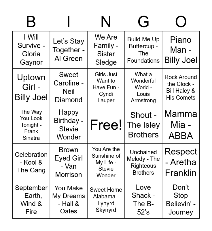 This bingo card has a free space and 37 words: Twist and Shout - The Beatles, Dancing Queen - ABBA, My Girl - The Temptations, Sweet Caroline - Neil Diamond, Respect - Aretha Franklin, Brown Eyed Girl - Van Morrison, Girls Just Want to Have Fun - Cyndi Lauper, Can’t Help Myself - The Four Tops, Piano Man - Billy Joel, I Wanna Dance with Somebody - Whitney Houston, Happy Birthday - Stevie Wonder, Build Me Up Buttercup - The Foundations, Don’t Stop Believin’ - Journey, Mamma Mia - ABBA, Uptown Girl - Billy Joel, Celebration - Kool & The Gang, Stand By Me - Ben E. King, We Are Family - Sister Sledge, You Are the Sunshine of My Life - Stevie Wonder, Shout - The Isley Brothers, I Will Survive - Gloria Gaynor, Rock Around the Clock - Bill Haley & His Comets, September - Earth, Wind & Fire, Sweet Home Alabama - Lynyrd Skynyrd, I’m a Believer - The Monkees, Love Shack - The B-52’s, Let’s Stay Together - Al Green, Happy Together - The Turtles, Ain’t No Mountain High Enough - Marvin Gaye & Tammi Terrell, Walking on Sunshine - Katrina & The Waves, Stayin’ Alive - Bee Gees, You Make My Dreams - Hall & Oates, The Way You Look Tonight - Frank Sinatra, Birthday - The Beatles, Unchained Melody - The Righteous Brothers, What a Wonderful World - Louis Armstrong and Shake It Off - Taylor Swift.