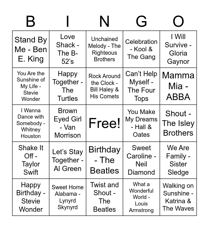 This bingo card has a free space and 36 words: September - Earth, Wind & Fire, My Girl - The Temptations, Uptown Girl - Billy Joel, Happy Together - The Turtles, Sweet Caroline - Neil Diamond, Shake It Off - Taylor Swift, Rock Around the Clock - Bill Haley & His Comets, Build Me Up Buttercup - The Foundations, I Will Survive - Gloria Gaynor, The Way You Look Tonight - Frank Sinatra, Brown Eyed Girl - Van Morrison, Celebration - Kool & The Gang, Don’t Stop Believin’ - Journey, You Make My Dreams - Hall & Oates, Mamma Mia - ABBA, Stand By Me - Ben E. King, Girls Just Want to Have Fun - Cyndi Lauper, Let’s Stay Together - Al Green, Walking on Sunshine - Katrina & The Waves, Unchained Melody - The Righteous Brothers, Shout - The Isley Brothers, We Are Family - Sister Sledge, Sweet Home Alabama - Lynyrd Skynyrd, Happy Birthday - Stevie Wonder, Twist and Shout - The Beatles, Love Shack - The B-52’s, I Wanna Dance with Somebody - Whitney Houston, Stayin’ Alive - Bee Gees, Can’t Help Myself - The Four Tops, You Are the Sunshine of My Life - Stevie Wonder, Respect - Aretha Franklin, Ain’t No Mountain High Enough - Marvin Gaye & Tammi Terrell, What a Wonderful World - Louis Armstrong, Birthday - The Beatles, Piano Man - Billy Joel and Dancing Queen - ABBA.