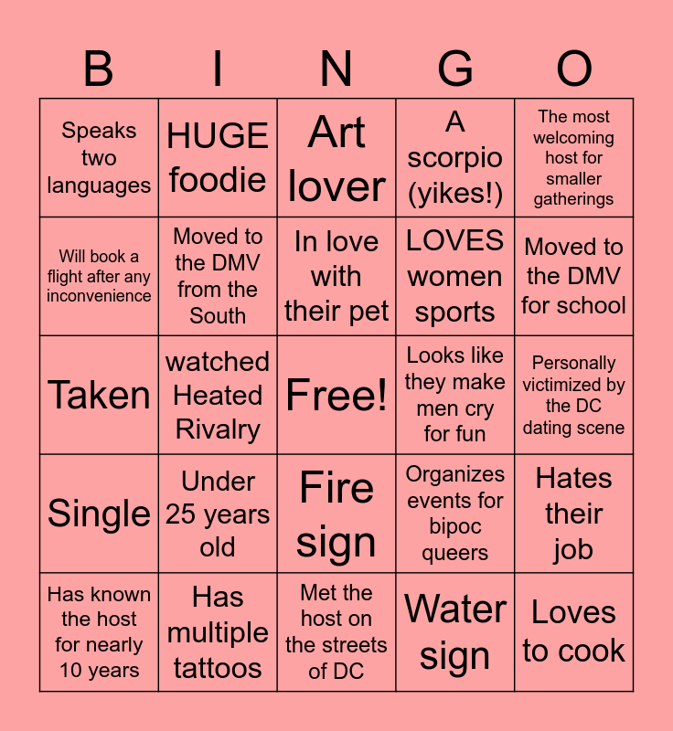 This bingo card has a free space and 29 words: Has known the host for nearly 10 years, Travelled in the past year, watched Heated Rivalry, Will do anything for their friends expect for text them back, Speaks two languages, Art lover, Moved to the DMV from the South, Under 25 years old, Looks like they make men cry for fun, Has multiple tattoos, Personally victimized by the DC dating scene, Loves to cook, Met the host on the streets of DC, Water sign, Moved to the DMV for school, Will find them on the dance floor every time, Fire sign, Single, The most welcoming host for smaller gatherings, Taken, Organizes events for bipoc queers, The host's roommate, LOVES women sports, Will book a flight after any inconvenience, A scorpio (yikes!), HUGE foodie, Hates their job, In love with their pet and Won't stop talking about the Bad Bunny halftime show.