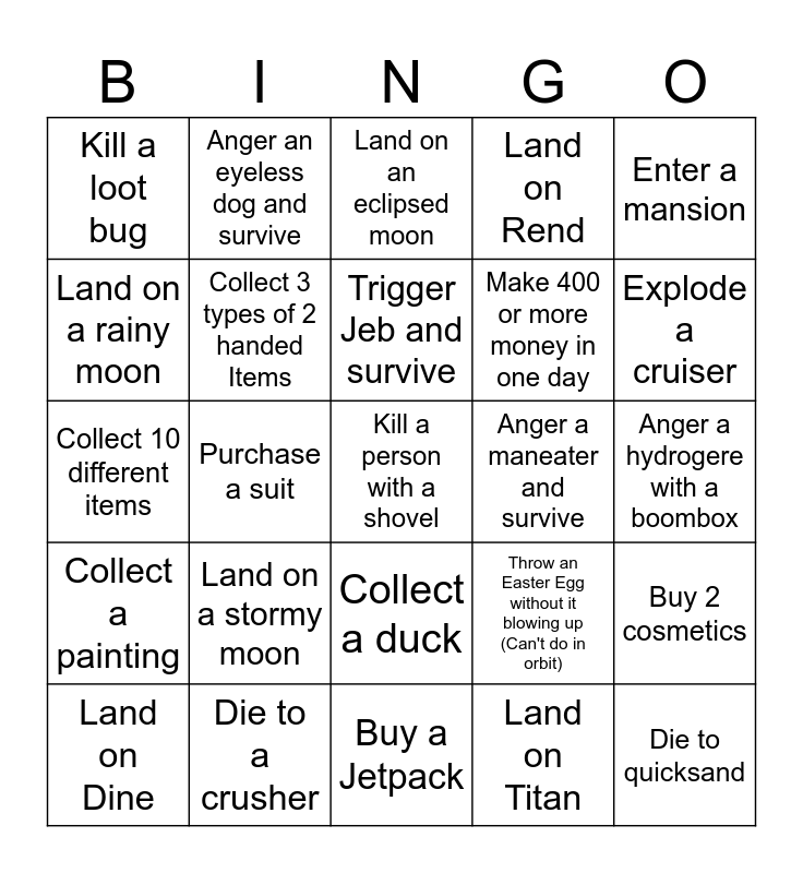 This bingo card has 25 words: Land on a stormy moon, Buy a Jetpack, Trigger Jeb and survive, Land on Dine, Enter a mansion, Kill a loot bug, Land on a rainy moon, Anger an eyeless dog and survive, Anger a maneater and survive, Collect a duck, Make 400 or more money in one day, Collect 10 different items, Throw an Easter Egg without it blowing up (Can't do in orbit), Buy 2 cosmetics, Collect 3 types of 2 handed Items, Die to quicksand, Anger a hydrogere with a boombox, Land on an eclipsed moon, Explode a cruiser, Purchase a suit, Kill a person with a shovel, Die to a crusher, Collect a painting, Land on Rend and Land on Titan.