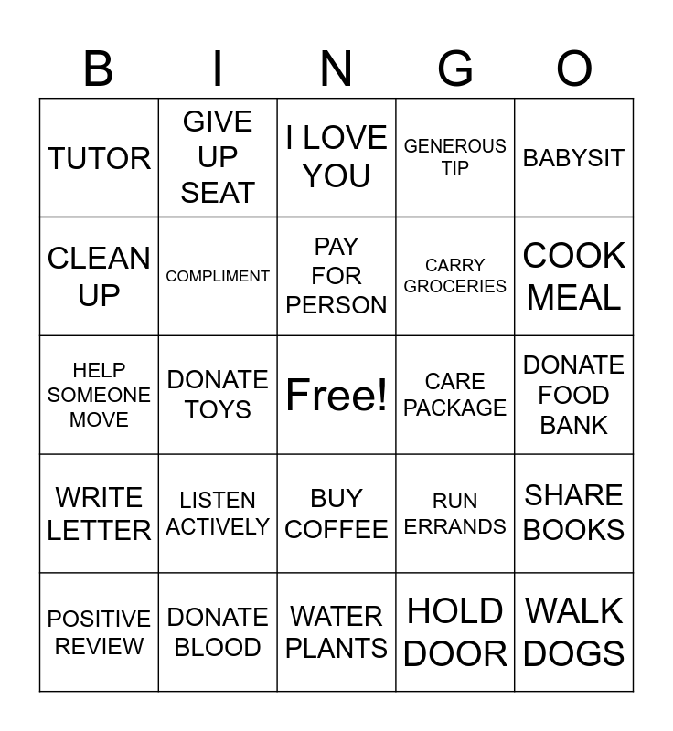 This bingo card has a free space and 34 words: SMILE, HOLD DOOR, THANK YOU NOTE, DONATE CLOTHES, WRITE LETTER, COMPLIMENT, BABYSIT, POSITIVE REVIEW, GIVE UP SEAT, PLANT TREE, PAY FOR PERSON, I LOVE YOU, VOLUNTEER SHELTER, GENUINE COMPLIMENT, CARE PACKAGE, COOK MEAL, DONATE BLOOD, HELP SOMEONE MOVE, LISTEN ACTIVELY, RUN ERRANDS, BUY COFFEE, FOSTER ANIMAL, TUTOR, DONATE FOOD BANK, WATER PLANTS, WALK DOGS, GENEROUS TIP, SEND FLOWERS, CARRY GROCERIES, CLEAN UP, VISIT NURSING HOME, DONATE TOYS, SHARE BOOKS and SUPPORTIVE EMAIL.