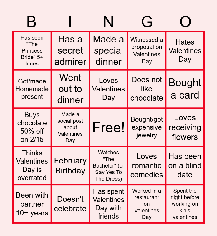 This bingo card has a free space and 24 words: February Birthday, Doesn't celebrate, Loves Valentines Day, Been with partner 10+ years, Hates Valentines Day, Has seen "The Princess Bride" 5+ times, Got/made Homemade present, Has a secret admirer, Bought/got expensive jewelry, Watches "The Bachelor" (or Say Yes To The Dress), Does not like chocolate, Buys chocolate 50% off on 2/15, Loves romantic comedies, Has been on a blind date, Went out to dinner, Worked in a restaurant on Valentines Day, Loves receiving flowers, Made a special dinner, Bought a card, Made a social post about Valentines Day, Spent the night before working on kid's valentines, Thinks Valentines Day is overrated, Witnessed a proposal on Valentines Day and Has spent Valentines Day with friends.