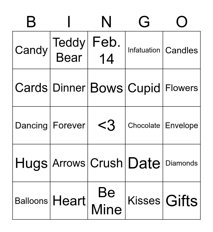 This bingo card has a free space and 25 words: Arrows, Be Mine, Bows, Balloons, Candles, Candy, Cards, Teddy Bear, Chocolate, Crush, Cupid, Dancing, Date, Diamonds, Dinner, Doves, Envelope, Feb. 14, Flowers, Forever, Gifts, Heart, Hugs, Infatuation and Kisses.