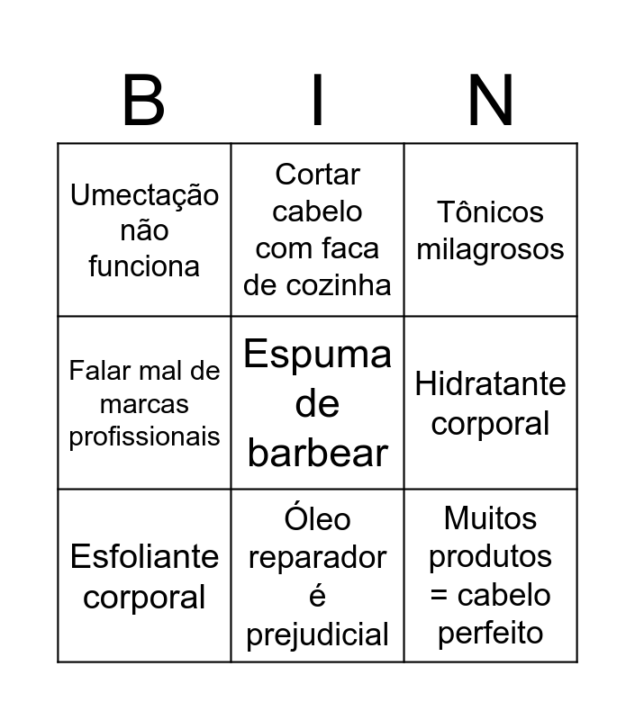 This bingo card has 9 words: Esfoliante corporal, Tônicos milagrosos, Cortar cabelo com faca de cozinha, Falar mal de marcas profissionais, Umectação não funciona, Hidratante corporal, Espuma de barbear, Muitos produtos = cabelo perfeito and Óleo reparador é prejudicial.