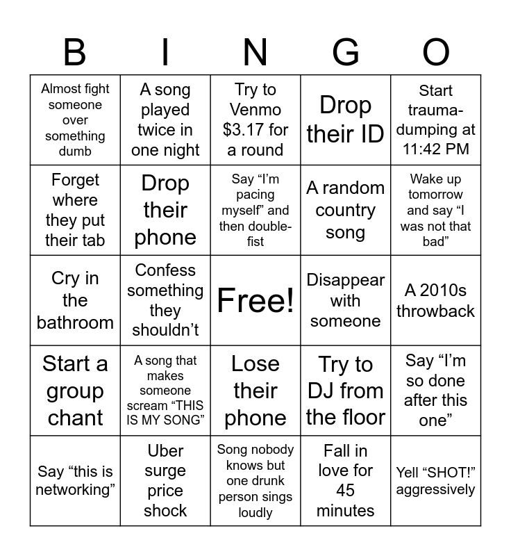 This bingo card has a free space and 35 words: Get way too drunk way too fast, Spill a drink on themselves, Spill a drink on someone else, Drop their phone, Lose their phone, Drop their ID, Forget where they put their tab, Order water and immediately get roasted, Say “I’m pacing myself” and then double-fist, Throw up (bathroom or outside — bonus square if both), Cry in the bathroom, Start trauma-dumping at 11:42 PM, Text their ex, Call their ex, Almost fight someone over something dumb, Disappear with someone, Fall in love for 45 minutes, Confess something they shouldn’t, Start a group chant, Yell “SHOT!” aggressively, Try to DJ from the floor, Say “this is networking”, Say “I’m so done after this one”, Uber surge price shock, Try to Venmo $3.17 for a round, Wake up tomorrow and say “I was not that bad”, “Mr. Brightside” (everyone feral), “Low” – Flo Rida (mandatory Tampa activation), A random country song, A 2010s throwback, Taylor Swift scream-along, Song nobody knows but one drunk person sings loudly, A song that makes someone scream “THIS IS MY SONG”, A song played twice in one night and Someone requests a song that never plays.