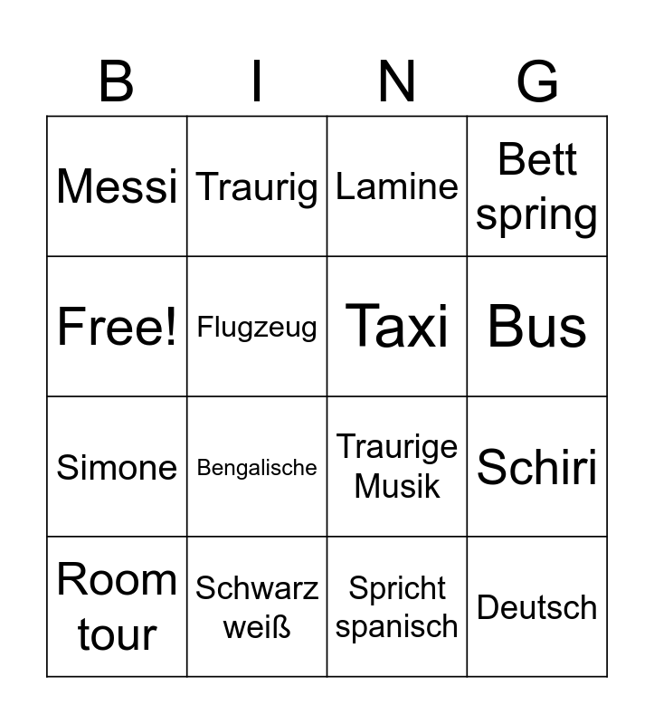 This bingo card has 16 words: Schwarz weiß, Schiri, Lamine, Messi, Simone, Traurig, Traurige Musik, Spricht spanisch, Free!, Flugzeug, Room tour, Bett spring, Bengalische, Bus, Taxi and Deutsch.
