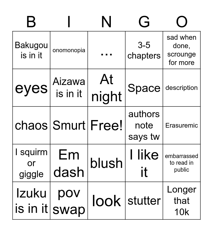 This bingo card has a free space and 28 words: embarrassed to read in public, AU, Space, stutter, eyes, ..., onomonopia, I squirm or giggle, authors note says tw, Izuku is in it, chaos, 3-5 chapters, pov swap, look, description, Other language(Made up or not), Em dash, Aizawa is in it, At night, blush, Bakugou is in it, angst, Longer that 10k, Smurt, Erasuremic, I like it, sad when done, scrounge for more and I find the smiley pfp person.