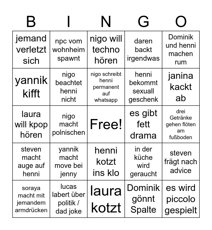 This bingo card has a free space and 24 words: yannik macht move bei jenny, lucas labert über politik / dad joke, nigo schreibt henni permanent auf whatsapp, soraya macht mit jemandem armdrücken, Dominik und henni machen rum, jemand verletzt sich, yannik kifft, npc vom wohnheim spawnt, es gibt fett drama, henni kotzt ins klo, henni bekommt sexuall geschenk, laura will kpop hören, in der küche wird geraucht, steven frägt nach advice, nigo beachtet henni nicht, Dominik gönnt Spalte, drei Getränke gehen flöten am fußboden, nigo will techno hören, janina kackt ab, nigo macht polnischen, es wird piccolo gespielt, steven macht auge auf henni, daren backt irgendwas and laura kotzt.