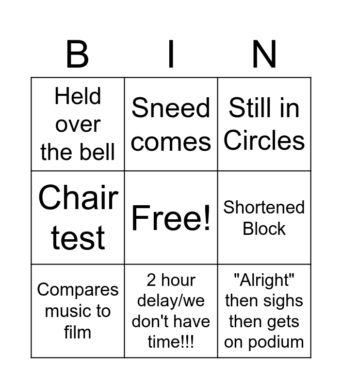 This bingo card has a free space and 8 words: Shortened Block, Still in Circles, Sneed comes, Compares music to film, Held over the bell, "Alright" then sighs then gets on podium, Chair test and 2 hour delay/we don't have time!!!.