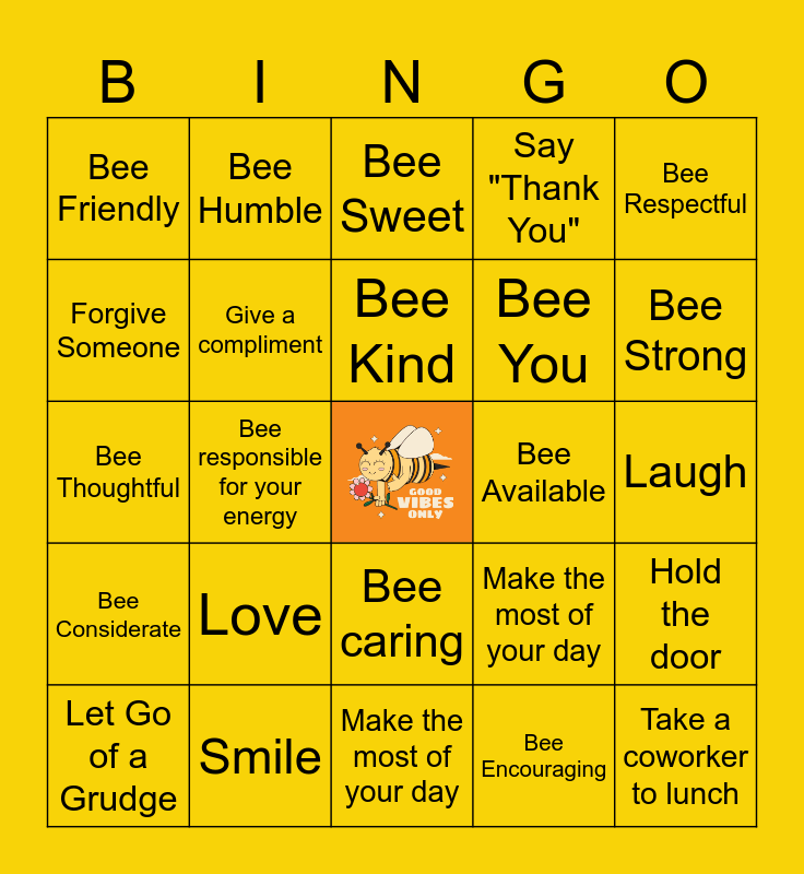 This bingo card has a free space and 24 words: Love, Smile, Bee Kind, Let Go of a Grudge, Bee Respectful, Bee Friendly, Forgive Someone, Bee Humble, Bee Available, Bee caring, Bee You, Bee Thoughtful, Make the most of your day, Hold the door, Give a compliment, Bee Encouraging, Laugh, Bee Sweet, Bee Strong, Bee responsible for your energy, Take a coworker to lunch, Bee Considerate, Say "Thank You" and Make the most of your day.