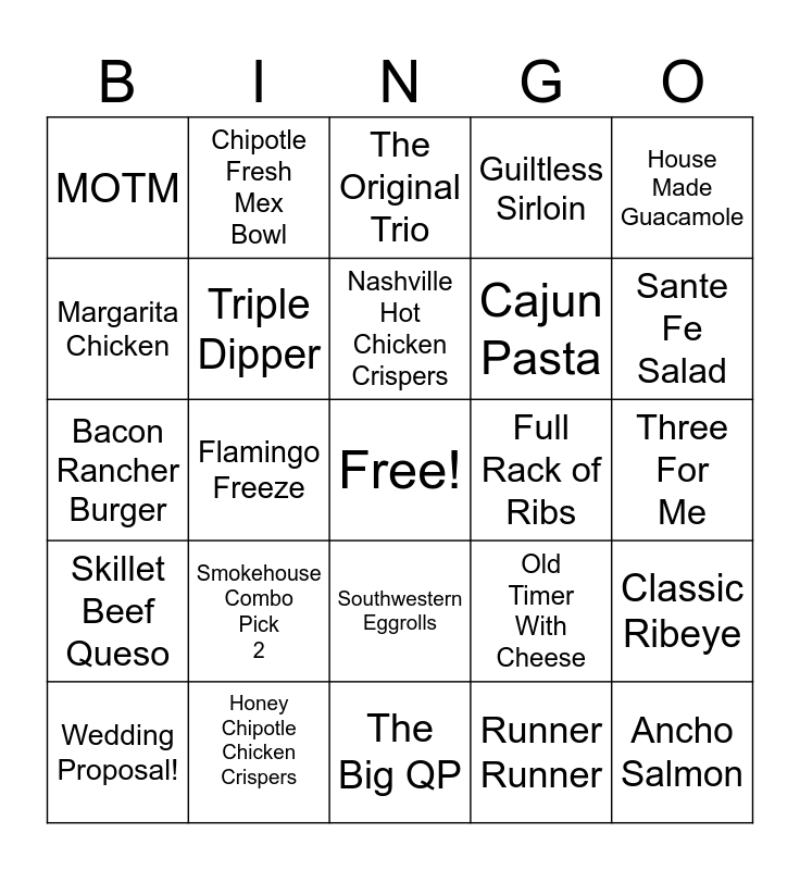 This bingo card has a free space and 29 words: Wedding Proposal!, Artic Drift, Flamingo Freeze, Skinny Rita, MOTM, The Original Trio, Triple Dipper, Smokehouse Combo Pick 2, Full Rack of Ribs, Honey Chipotle Chicken Crispers, Three For Me, Ancho Salmon, The Big QP, Runner Runner, Sante Fe Salad, Chicken Bacon Ranch Nachos, Southwestern Eggrolls, Skillet Beef Queso, House Made Guacamole, Bacon Rancher Burger, Old Timer With Cheese, Fajitas For 2, Cajun Pasta, Margarita Chicken, Guiltless Sirloin, Chipotle Fresh Mex Bowl, Classic Ribeye, Nashville Hot Chicken Crispers and Chicken Bacon Ranch Quesadillas.
