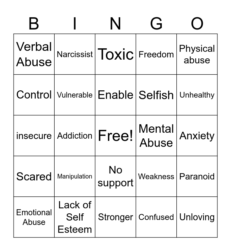 This bingo card has a free space and 24 words: Manipulation, Lack of Self Esteem, Enable, Emotional Abuse, Physical abuse, Verbal Abuse, Control, Narcissist, Mental Abuse, No support, Selfish, insecure, Weakness, Paranoid, Vulnerable, Confused, Anxiety, Toxic, Unhealthy, Addiction, Unloving, Scared, Freedom and Stronger.