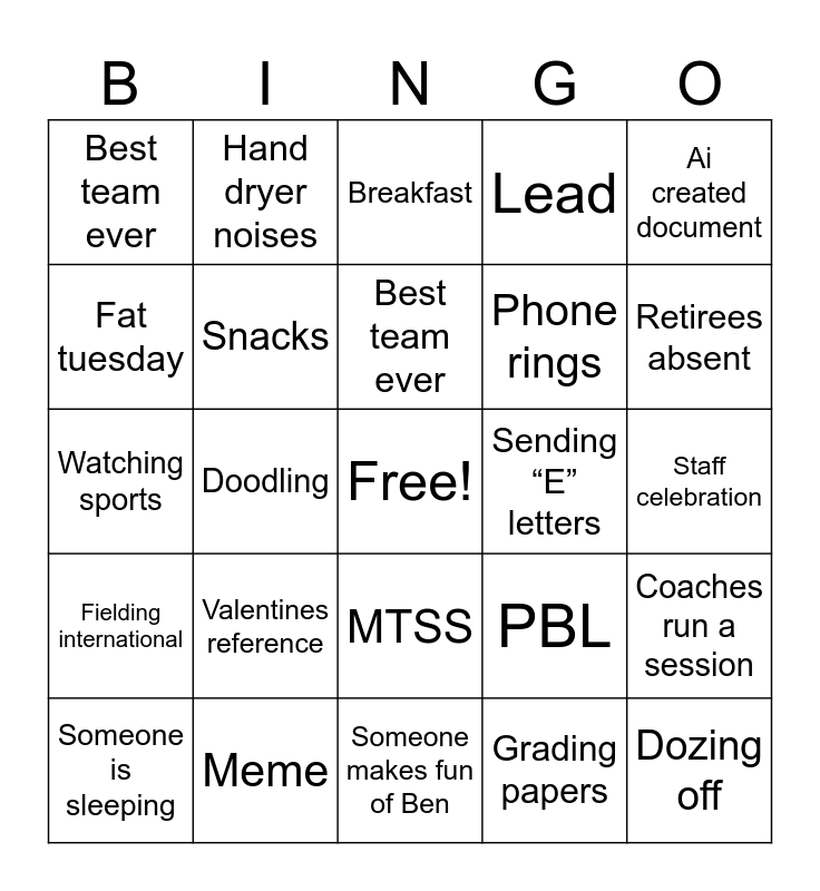 This bingo card has a free space and 24 words: Valentines reference, Meme, Best team ever, Someone is sleeping, Ai created document, Best team ever, Fat tuesday, Hand dryer noises, Sending “E” letters, MTSS, Phone rings, Watching sports, PBL, Coaches run a session, Snacks, Grading papers, Staff celebration, Breakfast, Retirees absent, Doodling, Dozing off, Fielding international, Lead and Someone makes fun of Ben.