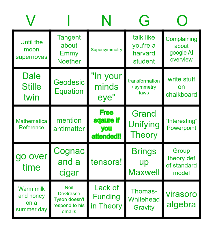 This bingo card has a free space and 24 words: Warm milk and honey on a summer day, Cognac and a cigar, "In your minds eye", Thomas-Whitehead Gravity, Complaining about google AI overview, Until the moon supernovas, Tangent about Emmy Noether, Supersymmetry, Grand Unifying Theory, "Interesting" Powerpoint, Mathematica Reference, Geodesic Equation, Brings up Maxwell, Group theory def of standard model, Dale Stille twin, Neil DeGrasse Tyson doesn't respond to his emails, Lack of Funding in Theory, talk like you're a harvard student, write stuff on chalkboard, go over time, mention antimatter, tensors!, transformation / symmetry laws and virasoro algebra.