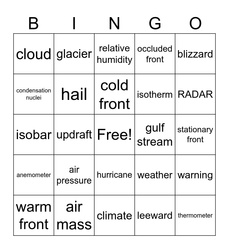 This bingo card has a free space and 24 words: air pressure, air mass, cold front, warm front, blizzard, cloud, condensation nuclei, glacier, gulf stream, hurricane, isotherm, isobar, weather, warning, hail, leeward, stationary front, relative humidity, RADAR, updraft, thermometer, anemometer, occluded front and climate.