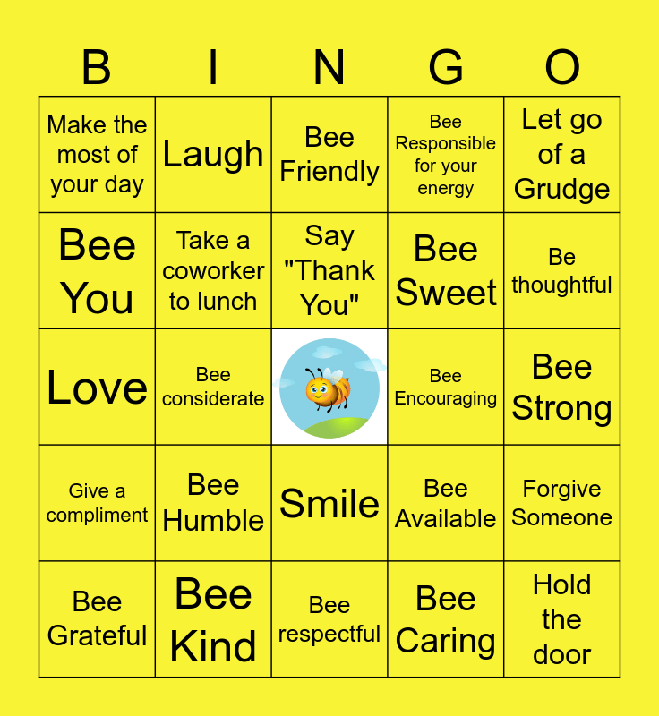 This bingo card has a free space and 24 words: Bee Humble, Bee Kind, Say "Thank You", Bee Grateful, Let go of a Grudge, Make the most of your day, Bee You, Laugh, Bee Encouraging, Smile, Bee Sweet, Love, Bee Available, Forgive Someone, Take a coworker to lunch, Bee Caring, Bee Strong, Bee Friendly, Be thoughtful, Bee considerate, Hold the door, Give a compliment, Bee Responsible for your energy and Bee respectful.