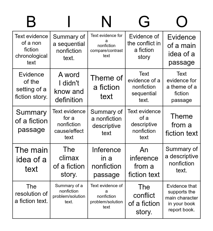 This bingo card has a free space and 24 words: The climax of a fiction story., Summary of a nonfiction problem/solution text., Theme of a fiction text, The resolution of a fiction text., Evidence of a main idea of a passage, Text evidence of a non fiction chronological text, Evidence of the setting of a fiction story., Summary of a sequential nonfiction text., Text evidence of a descriptive nonfiction text, Inference in a nonfiction passage, Text evidence of a nonfiction sequential text., Summary of a fiction passage, An inference from a fiction text, Summary of a descriptive nonfiction text., A word I didn't know and definition, The conflict of a fiction story., Theme from a fiction text, Text evidence for a nonfiction compare/contrast text, Text evidence for a theme of a fiction passage, Text evidence for a nonfiction cause/effect text, Evidence that supports the main character in your book report book., The main idea of a text, Evidence of the conflict in a fiction story and Text evidence of a nonfiction problem/solution text.