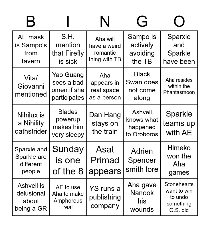 This bingo card has a free space and 24 words: Sunday is one of the 8, AE to use Aha to make Amphoreus real, Aha appears in real space as a person, Ashveil is delusional about being a GR, Sparxie and Sparkle have been, AE mask is Sampo's from tavern, Vita/ Giovanni mentioned, S.H. mention that Firefly is sick, Ashveil knows what happened to Oroboros, Asat Primad appears, Black Swan does not come along, Nihilux is a Nihility oathstrider, Adrien Spencer smith lore, Himeko won the Aha games, Yao Guang sees a bad omen if she participates, Aha gave Nanook his wounds, Sparkle teams up with AE, Aha will have a weird romantic thing with TB, Aha resides within the Phantasmoon, Blades powerup makes him very sleepy, Stonehearts want to win to undo something O.S. did, Sparxie and Sparkle are different people, Sampo is actively avoiding the TB and YS runs a publishing company.