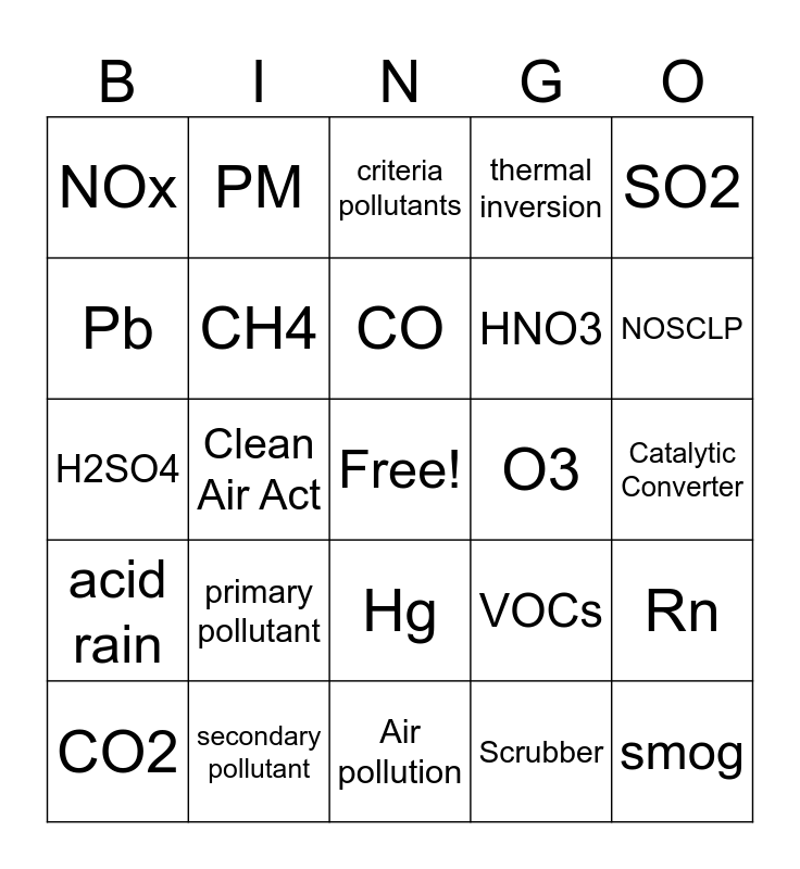 This bingo card has a free space and 24 words: primary pollutant, secondary pollutant, CO, CO2, SO2, NOx, Pb, PM, O3, Hg, HNO3, H2SO4, VOCs, Rn, CH4, Scrubber, Catalytic Converter, criteria pollutants, NOSCLP, Clean Air Act, smog, acid rain, thermal inversion and Air pollution.