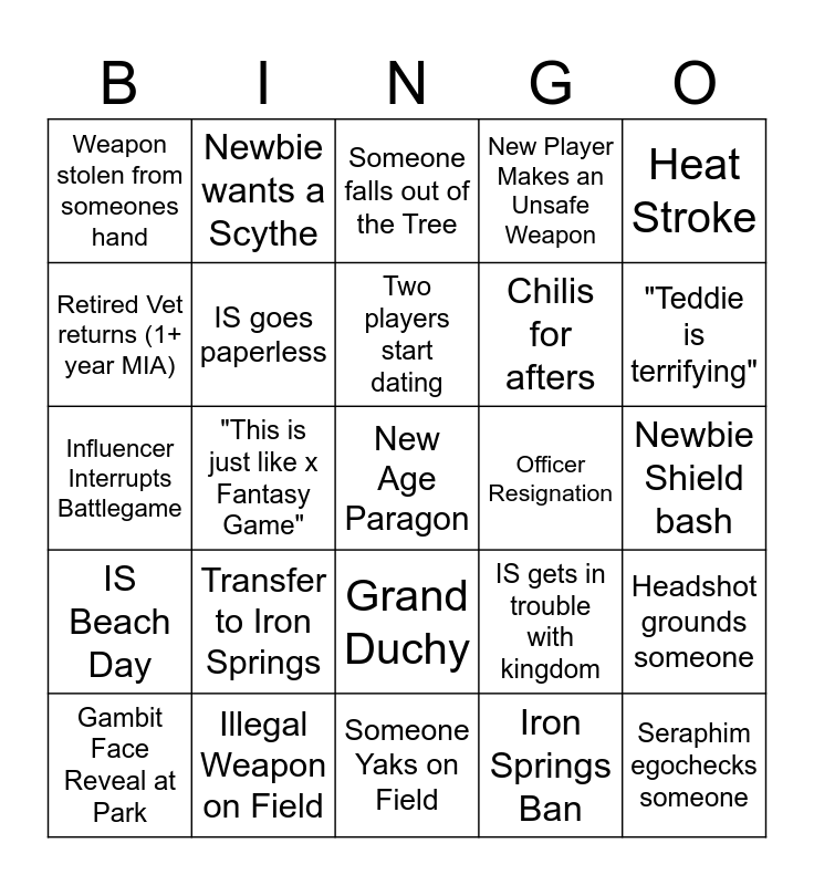 This bingo card has 45 words: Calliope 5th Warrior, New Age Paragon, New Age Kingdom Level Award, Gambit Face Reveal at Park, Broken Bone, Iron Springs Ban, Someone falls out of the Tree, Darko Pole Snaps, Heat Stroke, Illegal Weapon on Field, New Player Makes an Unsafe Weapon, Officer Resignation, Grand Duchy, Transfer to Iron Springs, Transfer from Iron Springs, Someone Yaks on Field, Iron Springser Gets Age Checked at Event, Influencer Interrupts Battlegame, Fighting company created and disbanded, "Teddie is terrifying", Newbie wants a Scythe, Iron Springs becomes internet famous, Dori gets injured, Weapon stolen from someones hand, Player's existence is a safety hazard, Newbie Shield bash, Combat Roll, Constant talking during game explanation, IS gets in trouble with kingdom, IS Beach Day, Controversial Kingdom Ban, Headshot grounds someone, Broken Glasses, Great held without permission, Rage quitting a battlegame, "This is just like x Fantasy Game", "Boss Battle", Two daggers and a dream, Seraphim egochecks someone, Two players start dating, Retired Vet returns (1+ year MIA), Chilis for afters, Backpedal into/over someone, IS goes paperless and Unexpected belting.