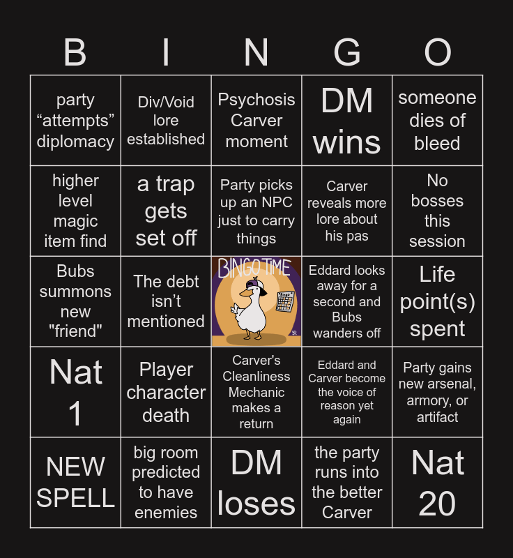 This bingo card has a free space and 24 words: Player character death, big room predicted to have enemies, Party picks up an NPC just to carry things, NEW SPELL, someone dies of bleed, party “attempts” diplomacy, higher level magic item find, Div/Void lore established, Eddard looks away for a second and Bubs wanders off, Carver's Cleanliness Mechanic makes a return, Carver reveals more lore about his pas, Bubs summons new "friend", Eddard and Carver become the voice of reason yet again, Party gains new arsenal, armory, or artifact, a trap gets set off, the party runs into the better Carver, Life point(s) spent, Psychosis Carver moment, No bosses this session, The debt isn’t mentioned, Nat 20, Nat 1, DM wins and DM loses.