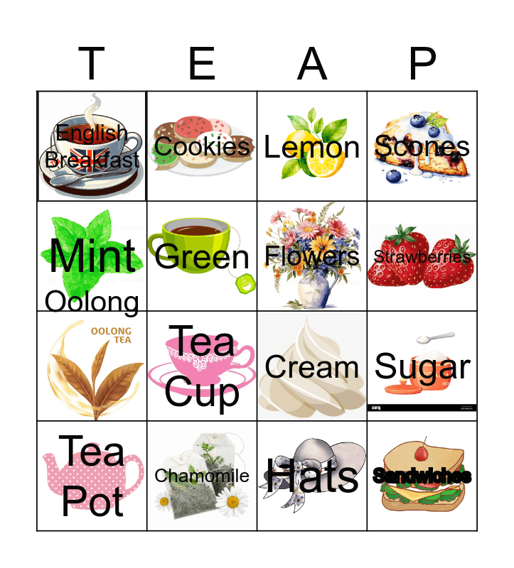 This bingo card has 16 images and 16 words: Tea Pot, Chamomile, Lemon, Scones, Mint, Cookies, Cream, Sugar, English Breakfast, Green, Hats, Strawberries, Oolong, Tea Cup, Flowers and Sandwiches.