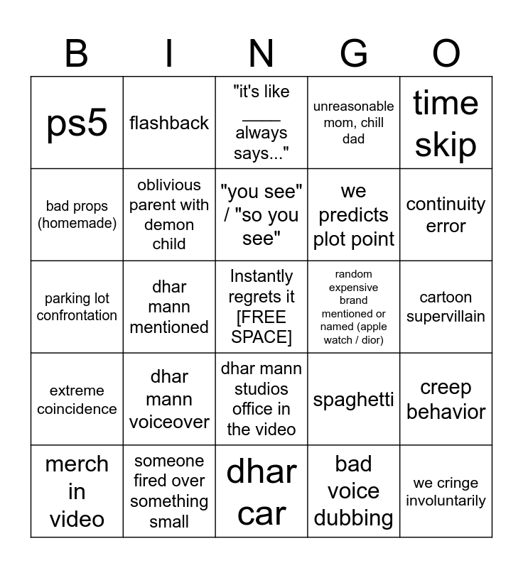 This bingo card has a free space and 25 words: dhar mann voiceover, dhar car, "you see" / "so you see", merch in video, time skip, ps5, bad props (homemade), flashback, random expensive brand mentioned or named (apple watch / dior), dhar mann studios office in the video, we predicts plot point, parking lot confrontation, spaghetti, creep behavior, oblivious parent with demon child, kids with ipad, cartoon supervillain, "it's like ____ always says...", continuity error, dhar mann mentioned, we cringe involuntarily, someone fired over something small, extreme coincidence, unreasonable mom, chill dad and bad voice dubbing.