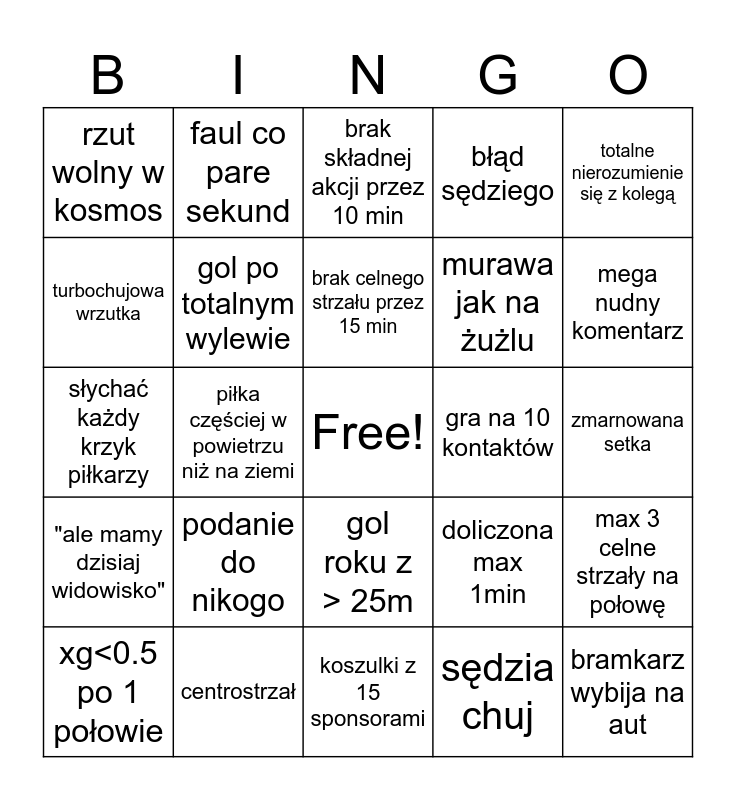 This bingo card has a free space and 24 words: podanie do nikogo, centrostrzał, brak celnego strzału przez 15 min, xg<0.5 po 1 połowie, totalne nierozumienie się z kolegą, rzut wolny w kosmos, turbochujowa wrzutka, faul co pare sekund, gra na 10 kontaktów, gol roku z > 25m, murawa jak na żużlu, słychać każdy krzyk piłkarzy, doliczona max 1min, max 3 celne strzały na połowę, gol po totalnym wylewie, sędzia chuj, zmarnowana setka, brak składnej akcji przez 10 min, mega nudny komentarz, piłka częściej w powietrzu niż na ziemi, bramkarz wybija na aut, "ale mamy dzisiaj widowisko", błąd sędziego and koszulki z 15 sponsorami.