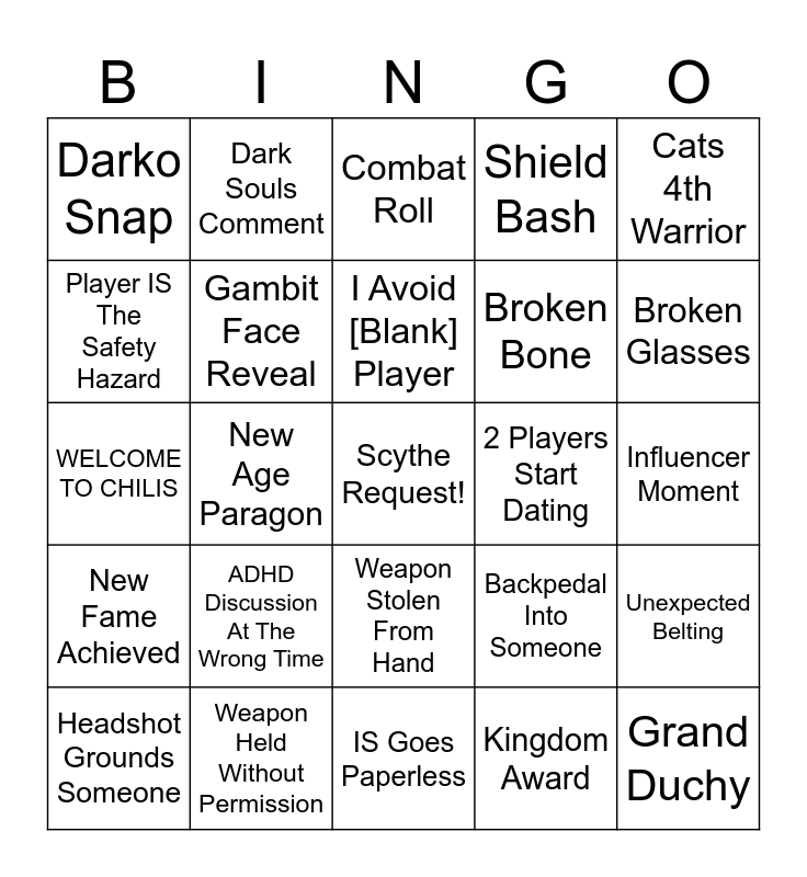 This bingo card has a free space and 24 words: ADHD Discussion At The Wrong Time, Weapon Held Without Permission, I Avoid [Blank] Player, Headshot Grounds Someone, Cats 4th Warrior, Darko Snap, Player IS The Safety Hazard, Dark Souls Comment, 2 Players Start Dating, Weapon Stolen From Hand, Broken Bone, WELCOME TO CHILIS, Backpedal Into Someone, Unexpected Belting, Gambit Face Reveal, Kingdom Award, Influencer Moment, Combat Roll, Broken Glasses, New Age Paragon, Grand Duchy, New Fame Achieved, Shield Bash and IS Goes Paperless.