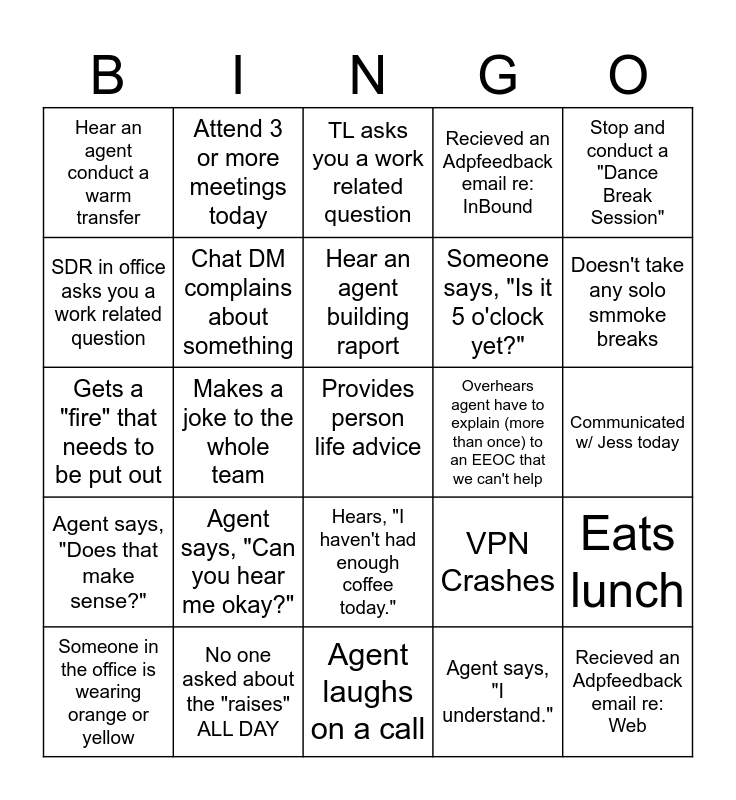 This bingo card has 25 words: Agent says, "Can you hear me okay?", Agent laughs on a call, Hear an agent building raport, Someone in the office is wearing orange or yellow, Stop and conduct a "Dance Break Session", Hear an agent conduct a warm transfer, SDR in office asks you a work related question, Attend 3 or more meetings today, Overhears agent have to explain (more than once) to an EEOC that we can't help, Hears, "I haven't had enough coffee today.", Someone says, "Is it 5 o'clock yet?", Gets a "fire" that needs to be put out, VPN Crashes, Eats lunch, Chat DM complains about something, Recieved an Adpfeedback email re: Web, Communicated w/ Jess today, TL asks you a work related question, Doesn't take any solo smmoke breaks, Makes a joke to the whole team, Provides person life advice, No one asked about the "raises" ALL DAY, Agent says, "Does that make sense?", Recieved an Adpfeedback email re: InBound and Agent says, "I understand.".