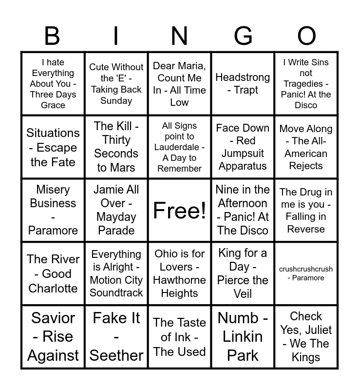 This bingo card has a free space and 42 words: Sugar, We're Going Down - Fall Out Boy, All Signs point to Lauderdale - A Day to Remember, Helena - My Chemical Romance, Everything is Alright - Motion City Soundtrack, Numb - Linkin Park, crushcrushcrush - Paramore, Check Yes, Juliet - We The Kings, I Caught Fire - The Used, Dear Maria, Count Me In - All Time Low, Ohio is for Lovers - Hawthorne Heights, The Drug in me is you - Falling in Reverse, Move Along - The All-American Rejects, Jamie All Over - Mayday Parade, I Write Sins not Tragedies - Panic! At the Disco, Sweetness - Jimmy Eat World, King for a Day - Pierce the Veil, Miss Murder - AFI, Misery Business - Paramore, You're gonna go far kid - The Offspring, Cute Without the 'E' - Taking Back Sunday, Situations - Escape the Fate, Na Na Na NA - My Chemical Romance, My Own Worst Enemy - Lit, I hate Everything About You - Three Days Grace, I'm Just a Kid - Simple Plan, I Miss You - blink-182, Face Down - Red Jumpsuit Apparatus, The Downfall of Us All - A Day to Remember, Can You Feel My Heart - Bring Me the Horizon, Be My Escape - Relient K, Thnks Fr th Mmrs - Fall Out Boy, The River - Good Charlotte, The Kill - Thirty Seconds to Mars, The Taste of Ink - The Used, Honestly - Cartel, Savior - Rise Against, Fake It - Seether, Nine in the Afternoon - Panic! At The Disco, Kryptonite - 3 Doors Down, Pain - Jimmy Eat World, Headstrong - Trapt and Chop Suey! - System of a Down.