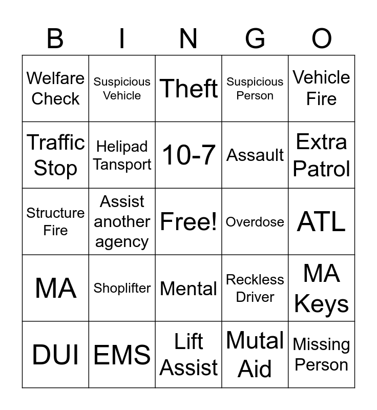 This bingo card has a free space and 29 words: DUI, Animal Complaint, Assist another agency, Juvenile Complaint, Welfare Check, Theft, Helipad Tansport, Shoplifter, Overdose, EMS, ATL, Missing Person, Lift Assist, Mutal Aid, Extra Patrol, 10-45, Mental, MA, Vehicle Fire, Structure Fire, Reckless Driver, Gas Odor/Leak, Assault, Traffic Stop, Suspicious Person, Suspicious Vehicle, MA Keys, 10-7 and DUI.