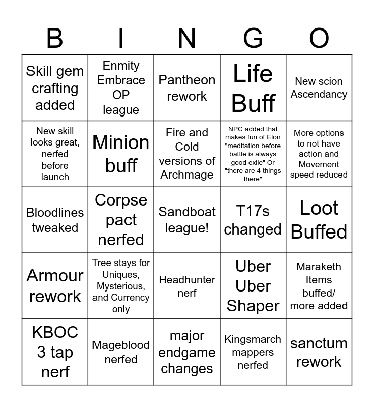 This bingo card has a free space and 24 words: Tree stays for Uniques, Mysterious, and Currency only, Mageblood nerfed, Fire and Cold versions of Archmage, KBOC 3 tap nerf, New scion Ascendancy, Skill gem crafting added, New skill looks great, nerfed before launch, Enmity Embrace OP league, T17s changed, Headhunter nerf, NPC added that makes fun of Elon "meditation before battle is always good exile" Or "there are 4 things there", Bloodlines tweaked, Uber Uber Shaper, Maraketh Items buffed/ more added, Minion buff, Kingsmarch mappers nerfed, Loot Buffed, Pantheon rework, More options to not have action and Movement speed reduced, Corpse pact nerfed, sanctum rework, Armour rework, Life Buff and major endgame changes.
