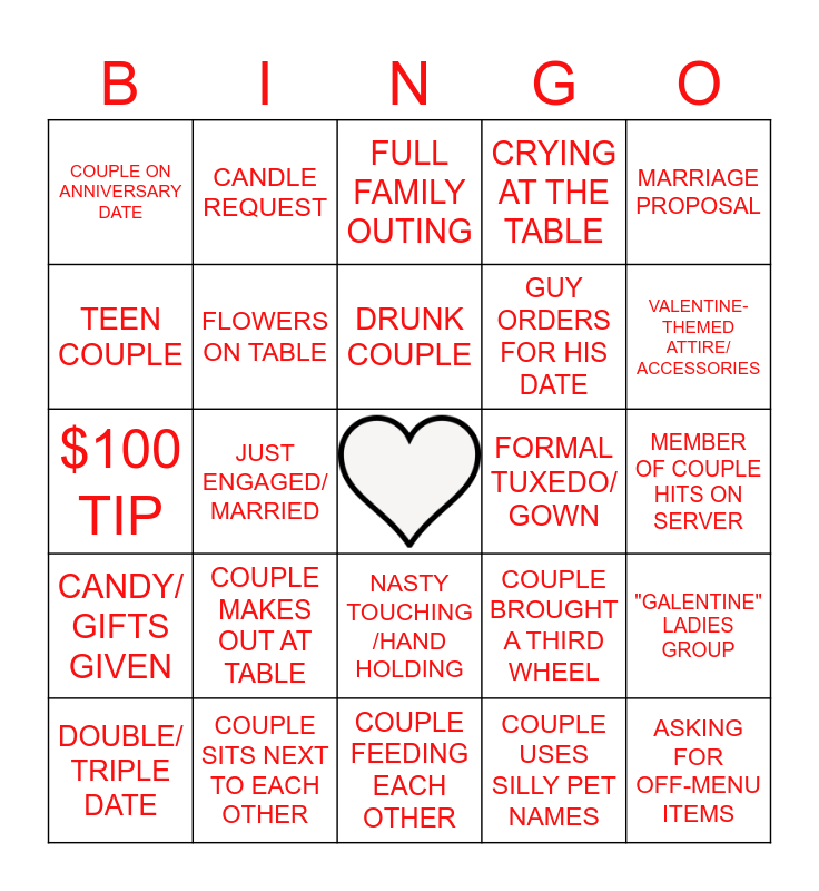This bingo card has a free space and 24 words: COUPLE MAKES OUT AT TABLE, COUPLE SITS NEXT TO EACH OTHER, DRUNK COUPLE, DOUBLE/ TRIPLE DATE, MARRIAGE PROPOSAL, COUPLE ON ANNIVERSARY DATE, TEEN COUPLE, CANDLE REQUEST, FORMAL TUXEDO/ GOWN, NASTY TOUCHING /HAND HOLDING, GUY ORDERS FOR HIS DATE, $100 TIP, COUPLE BROUGHT A THIRD WHEEL, "GALENTINE" LADIES GROUP, FLOWERS ON TABLE, COUPLE USES SILLY PET NAMES, MEMBER OF COUPLE HITS ON SERVER, FULL FAMILY OUTING, VALENTINE- THEMED ATTIRE/ ACCESSORIES, JUST ENGAGED/ MARRIED, ASKING FOR OFF-MENU ITEMS, CANDY/ GIFTS GIVEN, CRYING AT THE TABLE and COUPLE FEEDING EACH OTHER.