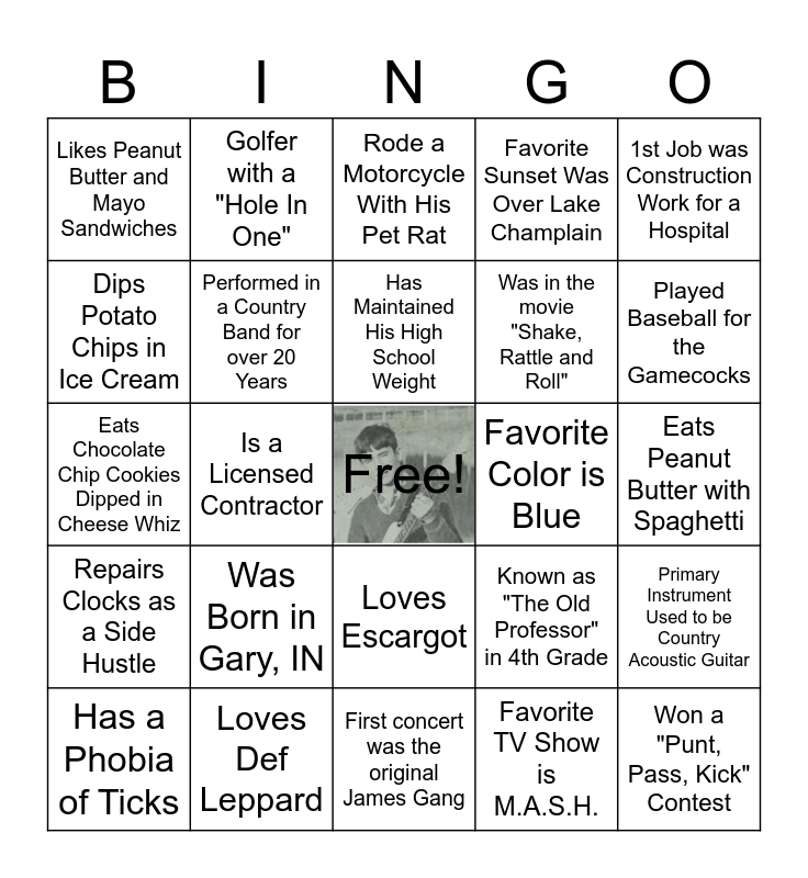 This bingo card has a free space and 32 words: Favorite TV Show is M.A.S.H., Sang on a PBS Children's Special, Is a Licensed Contractor, Single Dad Raising a Daughter, Repairs Clocks as a Side Hustle, Performed in a Country Band for over 20 Years, 1st Job was Construction Work for a Hospital, Primary Instrument Used to be Country Acoustic Guitar, Golfer with a "Hole In One", Was an extra in a movie with Charleton Heston, Has Maintained His High School Weight, Rode a Motorcycle With His Pet Rat, App State University Alum, Played in "Carnival" in the 70's, Favorite Color is Blue, Plays the Banjo, Has a Phobia of Ticks, Eats Chocolate Chip Cookies Dipped in Cheese Whiz, Loves Escargot, Was Born in Gary, IN, Known as "The Old Professor" in 4th Grade, Only Goes to the Grocery Store on Senior Day, Eats Peanut Butter with Spaghetti, Loves Def Leppard, Won a "Punt, Pass, Kick" Contest, Favorite Sunset Was Over Lake Champlain, Was in the movie "Shake, Rattle and Roll", Dips Potato Chips in Ice Cream, Likes Peanut Butter and Mayo Sandwiches, First concert was the original James Gang, Declares Himself "The Biggest Potato Eater in the World" and Played Baseball for the Gamecocks.