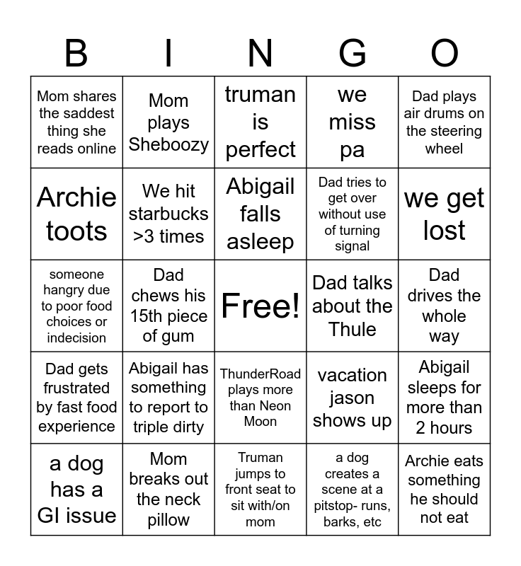 This bingo card has a free space and 24 words: Abigail has something to report to triple dirty, Mom breaks out the neck pillow, Abigail falls asleep, a dog has a GI issue, Dad plays air drums on the steering wheel, Mom shares the saddest thing she reads online, Archie toots, Mom plays Sheboozy, Dad talks about the Thule, ThunderRoad plays more than Neon Moon, Dad tries to get over without use of turning signal, someone hangry due to poor food choices or indecision, vacation jason shows up, Abigail sleeps for more than 2 hours, We hit starbucks >3 times, a dog creates a scene at a pitstop- runs, barks, etc, Dad drives the whole way, truman is perfect, we get lost, Dad chews his 15th piece of gum, Archie eats something he should not eat, Dad gets frustrated by fast food experience, we miss pa and Truman jumps to front seat to sit with/on mom.