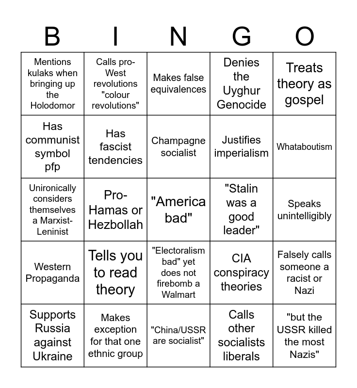 This bingo card has a free space and 24 words: Tells you to read theory, Makes exception for that one ethnic group, Champagne socialist, Supports Russia against Ukraine, Treats theory as gospel, Mentions kulaks when bringing up the Holodomor, Has communist symbol pfp, Calls pro-West revolutions "colour revolutions", "Stalin was a good leader", "Electoralism bad" yet does not firebomb a Walmart, Justifies imperialism, Unironically considers themselves a Marxist-Leninist, CIA conspiracy theories, Falsely calls someone a racist or Nazi, Has fascist tendencies, Calls other socialists liberals, Speaks unintelligibly, Makes false equivalences, Whataboutism, Pro-Hamas or Hezbollah, "but the USSR killed the most Nazis", Western Propaganda, Denies the Uyghur Genocide and "China/USSR are socialist".