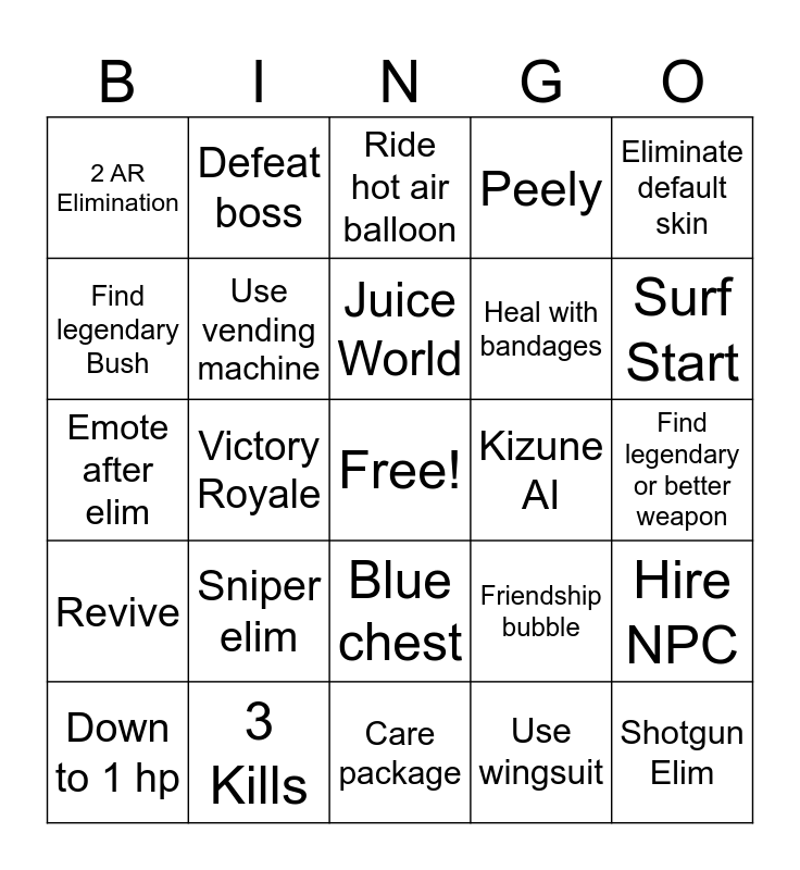 This bingo card has a free space and 24 words: Sniper elim, 3 Kills, Juice World, Down to 1 hp, Eliminate default skin, 2 AR Elimination, Find legendary Bush, Defeat boss, Kizune AI, Blue chest, Heal with bandages, Emote after elim, Friendship bubble, Hire NPC, Use vending machine, Use wingsuit, Find legendary or better weapon, Ride hot air balloon, Surf Start, Victory Royale, Shotgun Elim, Revive, Peely and Care package.