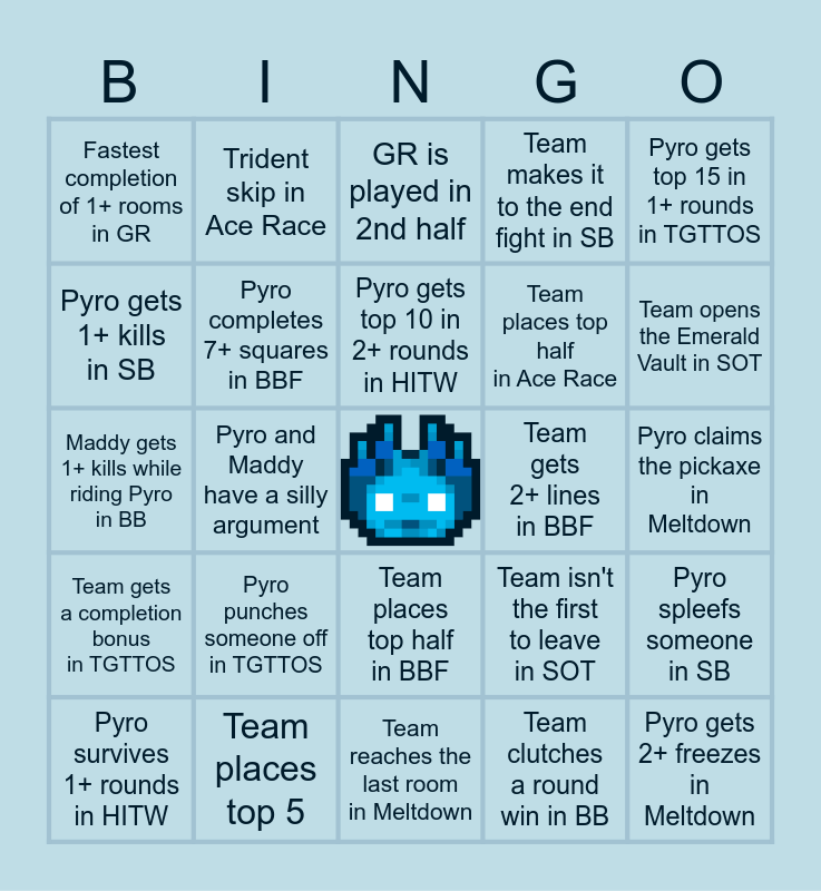 This bingo card has a free space and 30 words: Team places top 5, TGTTOS or HITW get skipped, Pyro and Maddy have a silly argument, Room involving redstone in GR, Fastest completion of 1+ rooms in GR, GR is played in 2nd half, Pyro completes 7+ squares in BBF, Team places top half in BBF, Team gets 2+ lines in BBF, Team reaches the last room in Meltdown, Pyro claims the pickaxe in Meltdown, Pyro gets 2+ freezes in Meltdown, Team clutches a round win in BB, Team wool rushes in BB, Team opens the Emerald Vault in SOT, Team opens 2+ vaults in SOT, Team isn't the first to leave in SOT, Team gets a completion bonus in TGTTOS, Pyro punches someone off in TGTTOS, Pyro gets top 15 in 1+ rounds in TGTTOS, Maddy gets 1+ kills while riding Pyro in BB, Pyro gets top 15 in Ace Race, Trident skip in Ace Race, Team places top half in Ace Race, Pyro gets 1+ kills in SB, Team makes it to the end fight in SB, Pyro spleefs someone in SB, Pyro survives 1+ rounds in HITW, Pyro gets top 10 in 2+ rounds in HITW and Team places top 3 in HITW.