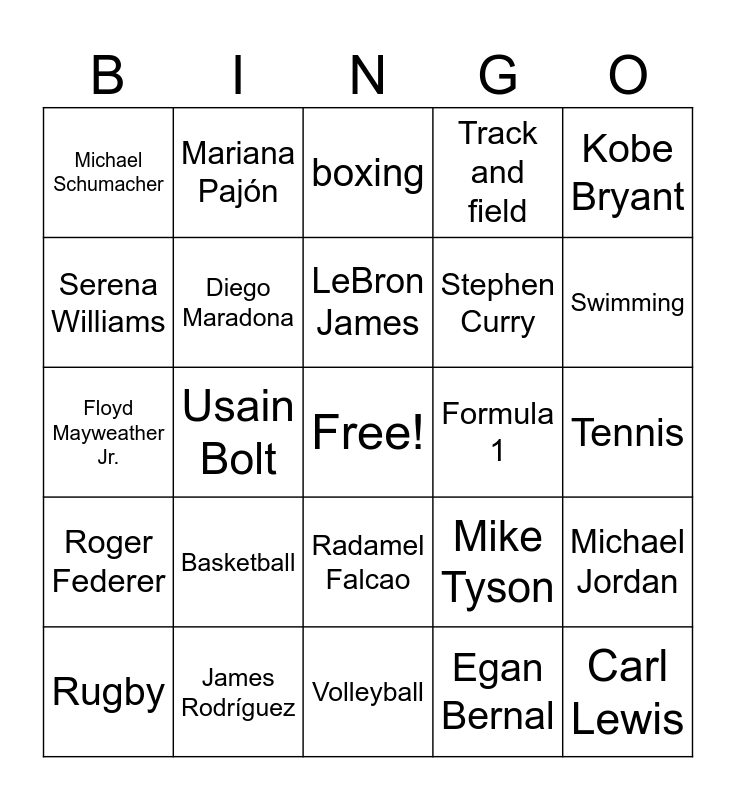 This bingo card has a free space and 38 words: Lionel Messi, Cristiano Ronaldo, Pelé, Diego Maradona, Michael Jordan, Basketball, LeBron James, Soccer, Kobe Bryant, Stephen Curry, Usain Bolt, Track and field, Carl Lewis, Tennis, Serena Williams, Roger Federer, Rafael Nadal, boxing, Muhammad Ali, Formula 1, Michael Schumacher, James Rodríguez, Swimming, Rugby, Golf, Volleyball, Water polo, Surfing, Skateboarding, American football, Hockey, Radamel Falcao, Egan Bernal, Mariana Pajón, Lewis Hamilton, Mike Tyson, Floyd Mayweather Jr. and Manny Pacquiao.