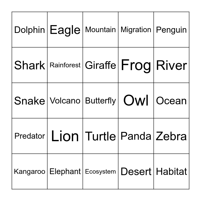 This bingo card has a free space and 24 words: Lion, Elephant, Giraffe, Kangaroo, Penguin, Dolphin, Shark, Eagle, Owl, Turtle, Frog, Snake, Panda, Zebra, Rainforest, Desert, Ocean, Mountain, River, Volcano, Habitat, Predator, Migration and Ecosystem.