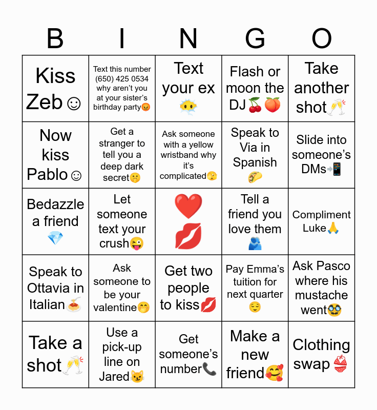 This bingo card has a free space and 24 words: Ask someone to be your valentine🤭, Use a pick-up line on Jared😼, Ask someone with a yellow wristband why it’s complicated🫣, Take a shot🥂, Take another shot🥂, Kiss Zeb☺️, Now kiss Pablo☺️, Text this number (650) 425 0534 why aren’t you at your sister’s birthday party😡, Tell a friend you love them🫂, Get two people to kiss💋, Speak to Via in Spanish🌮, Bedazzle a friend💎, Pay Emma’s tuition for next quarter😌, Ask Pasco where his mustache went🥸, Get a stranger to tell you a deep dark secret🤫, Make a new friend🥰, Compliment Luke🙏, Text your ex😶🌫️, Slide into someone’s DMs📲, Let someone text your crush😜, Clothing swap👙, Speak to Ottavia in Italian🍝, Flash or moon the DJ🍒🍑 and Get someone’s number📞.