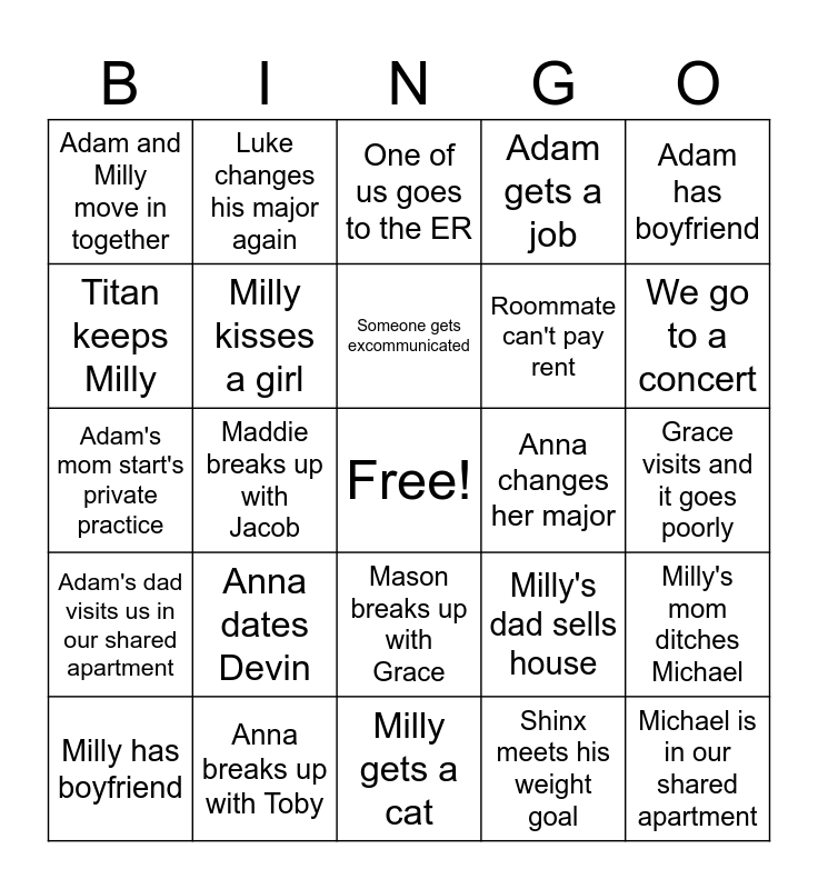 This bingo card has a free space and 24 words: Anna dates Devin, Anna breaks up with Toby, Someone gets excommunicated, Milly has boyfriend, Adam has boyfriend, Adam and Milly move in together, Titan keeps Milly, Luke changes his major again, Anna changes her major, Mason breaks up with Grace, Roommate can't pay rent, Adam's mom start's private practice, Milly's dad sells house, Milly's mom ditches Michael, Milly kisses a girl, Shinx meets his weight goal, Grace visits and it goes poorly, One of us goes to the ER, We go to a concert, Maddie breaks up with Jacob, Michael is in our shared apartment, Adam's dad visits us in our shared apartment, Adam gets a job and Milly gets a cat.