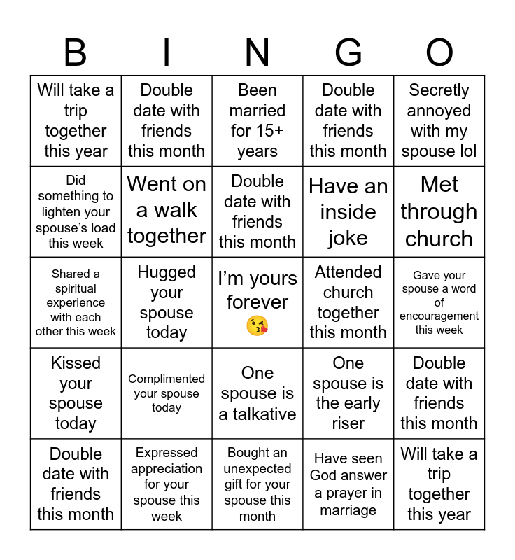 This bingo card has a free space and 29 words: Double date with friends this month, Laughed together today, Hugged your spouse today, Said”I love you” in the last 3 hours, Will take a trip together this year, Been married for 15+ years, Went on a walk together, Complimented your spouse today, Attended church together this month, Expressed appreciation for your spouse this week, Gave your spouse a word of encouragement this week, Will take a trip together this year, Bought an unexpected gift for your spouse this month, Have seen God answer a prayer in marriage, Met through church, Prayed for your spouse today, One spouse is a talkative, Kissed your spouse today, Secretly annoyed with my spouse lol, Shared a spiritual experience with each other this week, One spouse is the early riser, Have prayed for another couple this week, Have an inside joke, Did something to lighten your spouse’s load this week, Double date with friends this month, Double date with friends this month, Double date with friends this month, Double date with friends this month and Double date with friends this month.