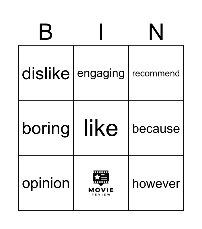 This bingo card has 1 images, a free space and 8 words: opinion, recommend, engaging, boring, dislike, because, however and favourite.