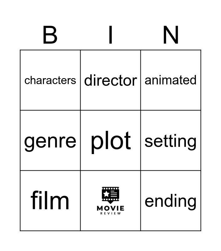This bingo card has 1 images, a free space and 8 words: film, animated, director, genre, characters, setting, ending and message.