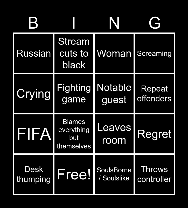 This bingo card has 28 words: League of Legends, Fortnite, FIFA, Shooter, Fighting game, Woman, Stream cuts to black, Throws controller, Free!, Throws headset, Leaves room, Screaming, Crashout over chat, Rage over skill issue, Blames everything but themselves, "This game sucks", Mannequin, Notable guest, Repeat offenders, Foreign, Russian, CSGO, Desk thumping, Regret, SoulsBorne / Soulslike, Rage game, Crying and Shirtless.